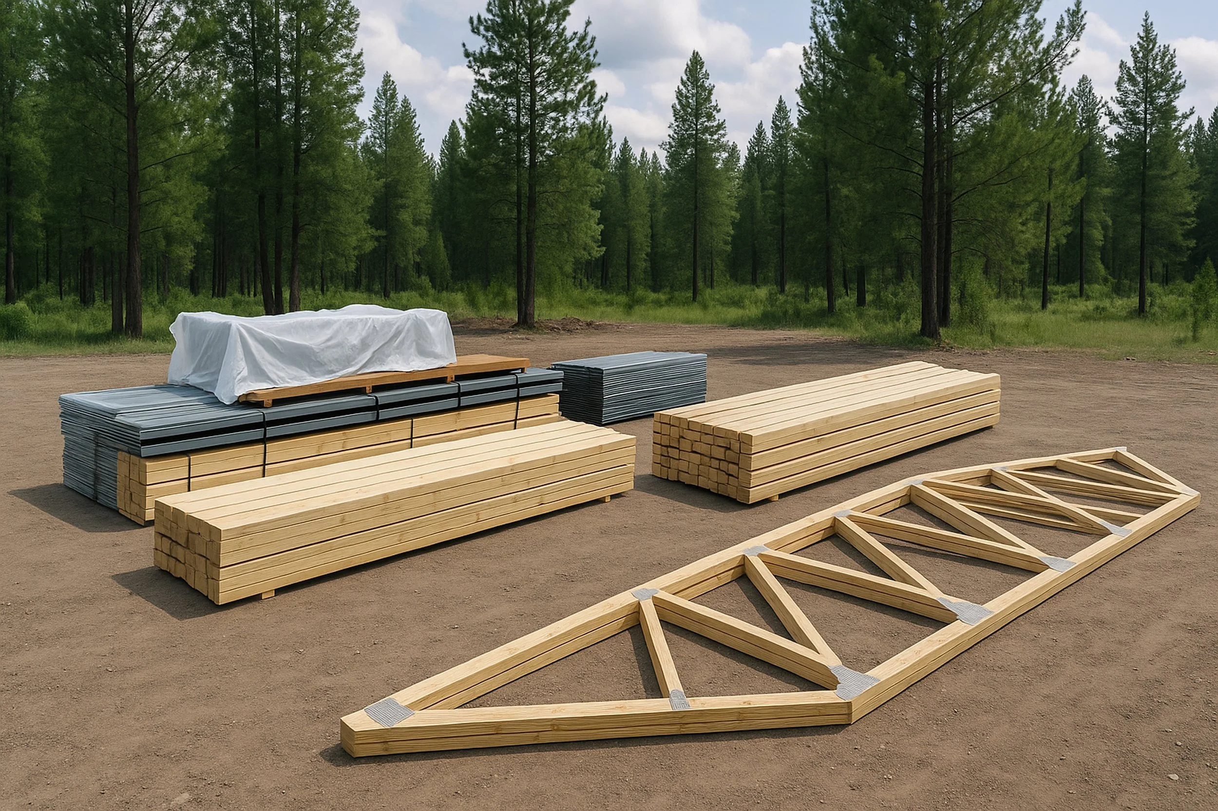 Kits designed for DIY builders or contractors, complete with posts, trusses, lumber, siding, and hardware